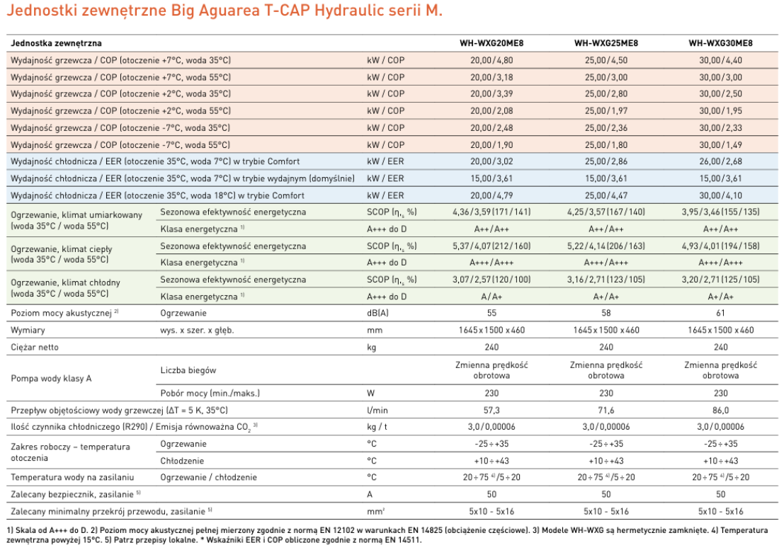Panasonic Big Aquarea T-CAP serii M obejmuje urządzenia o mocy 20, 25 i 30 kW. Wszystkie warianty są trójfazowe i współpracują z modułem sterowania, dlatego dobrze wpisują się w bardziej rozbudowane instalacje centralnego ogrzewania oraz układy przygotowania ciepłej wody użytkowej. Linia została przygotowana z myślą o budynkach wielorodzinnych, obiektach komercyjnych i inwestycjach, w których potrzebne jest wydajne źródło ciepła o większym zapasie mocy.