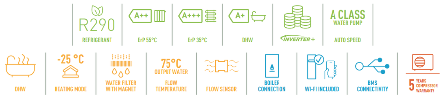 Wersja split daje większą elastyczność przy projektowaniu całego układu. Po stronie instalacji użytkownik zyskuje łatwiejsze dopasowanie systemu do warunków technicznych budynku i większą swobodę przy doborze jednostki wewnętrznej. Producent przewiduje połączenie hydrauliczne między jednostką zewnętrzną i wewnętrzną, a sam układ może pracować przy różnicy wysokości montażu sięgającej 30 metrów. W serii M dostępne są także wersje All in One z wbudowanym zasobnikiem CWU o pojemności 120, 185 lub 260 litrów, co ułatwia dopasowanie urządzenia do liczby domowników i ilości miejsca w pomieszczeniu technicznym.