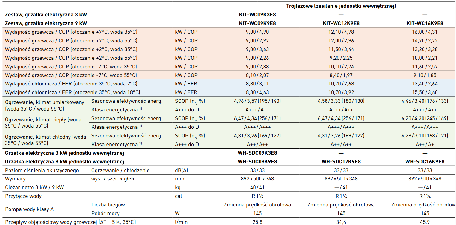 W modelu Panasonic KIT-ADC09K9E8 producent podaje moc grzewczą 9 kW przy A7/W35 oraz COP 4,9. Przy temperaturze zewnętrznej -7°C i wodzie grzewczej 35°C Panasonic KIT-ADC09K9E8 utrzymuje 9,0 kW, a COP wynosi 2,88. Sezonowa efektywność SCOP dla W35 została określona na poziomie 4,96, co przekłada się na klasę energetyczną A+++. Dla temperatury zasilania 55°C Panasonic KIT-ADC09K9E8 osiąga SCOP 3,57 i klasę A++.