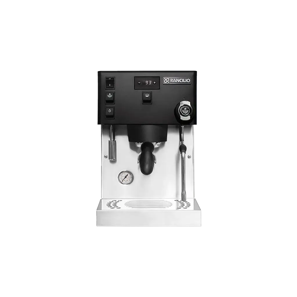 Korpus ze stali nierdzewnej, ergonomiczna kolba, izolowany bojler, wielokierunkowa dysza pary ze stali nierdzewnej, pokrętło pary, mosiężna jednostka zaparzająca, regulowana wysokość tacy na filiżanki. Komponenty handlowe Rancilio i technologia zaparzania w zaledwie 25 cm.