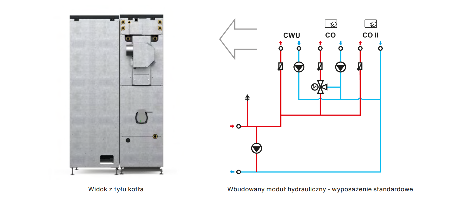 Dużą zaletą tego modelu jest również wbudowana instalacja hydrauliczna. Takie rozwiązanie porządkuje układ kotła i upraszcza montaż całego urządzenia. Cortina Next należy dzięki temu do grupy nowocześniejszych kotłów pelletowych, które łączą zwartą budowę z szerokim wyposażeniem standardowym.