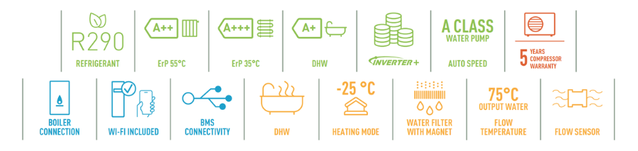 Urządzenie wyposażono w magnetyczny filtr wody, przepływomierz, pompę wody klasy A oraz system Inverter Plus. Do dyspozycji użytkownika pozostaje także nowy sterownik z czytelnym interfejsem i rozbudowanymi funkcjami, w tym sterowaniem 2-strefowym oraz sterowaniem biwalentnym. System można zintegrować z BMS. Na uwagę zasługuje również niski poziom hałasu oraz wbudowany moduł WiFi.